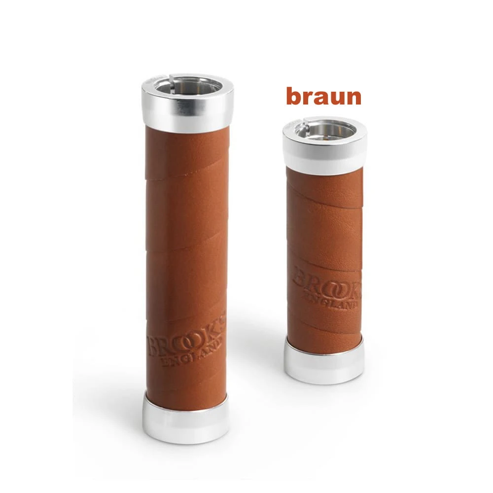 Met deze handvatten biedt Brooks de mogelijkheid om toch een schakelpook te monteren – rechts of links – als de lengte van het stuur beperkt is. Een aluminium hoes omwikkeld met het fijnste echt lederen stuurlint. Stijlvolle look en comfortabele grip, ongelooflijk goed afgewerkt.
