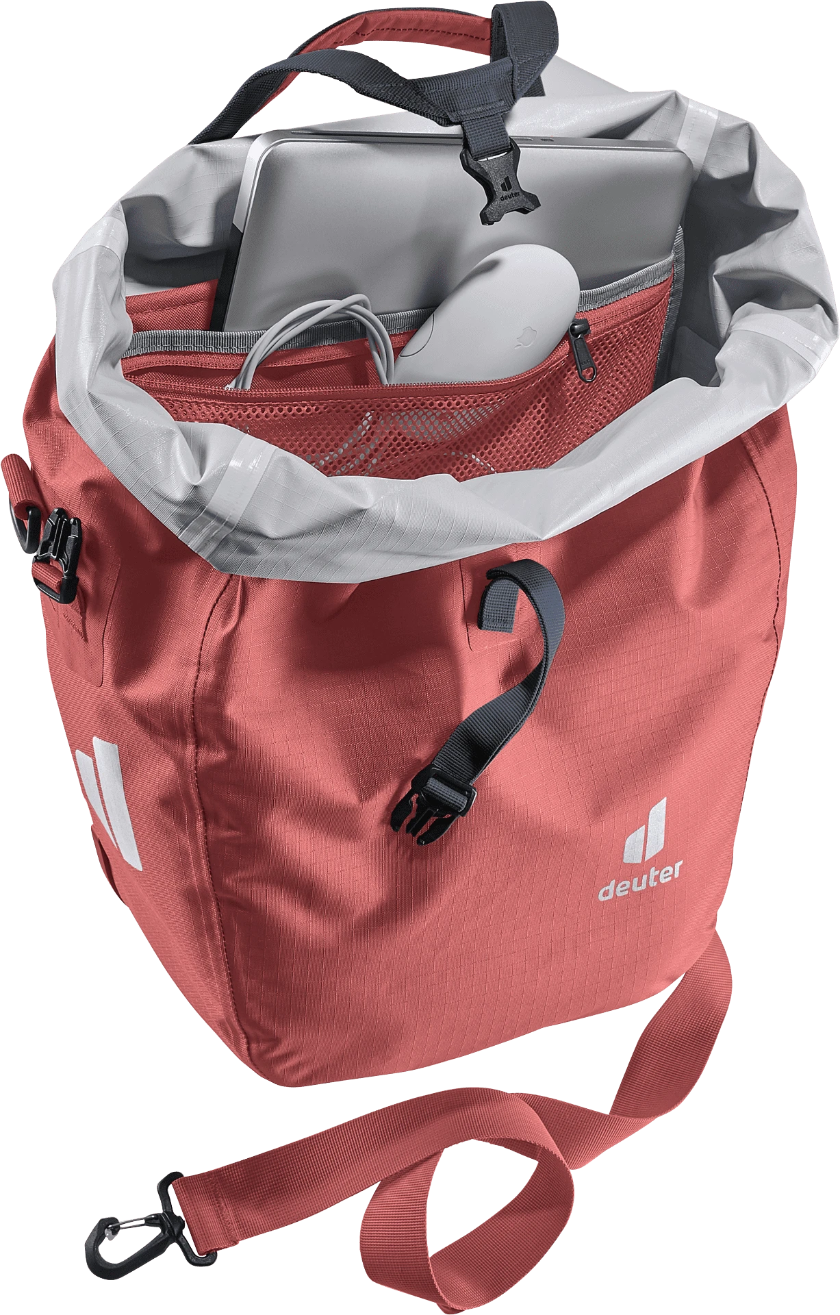 Of pure opbergtas met organizer unit op het achterwiel, grotere schoudertas om om je nek te hangen of praktische draagtas. Dankzij de afneembare schouderriem en de verstelbare draaggreepsluiting met universele houder voor slaapmat of jas zijn er nauwelijks grenzen aan het gebruik van deze tas.