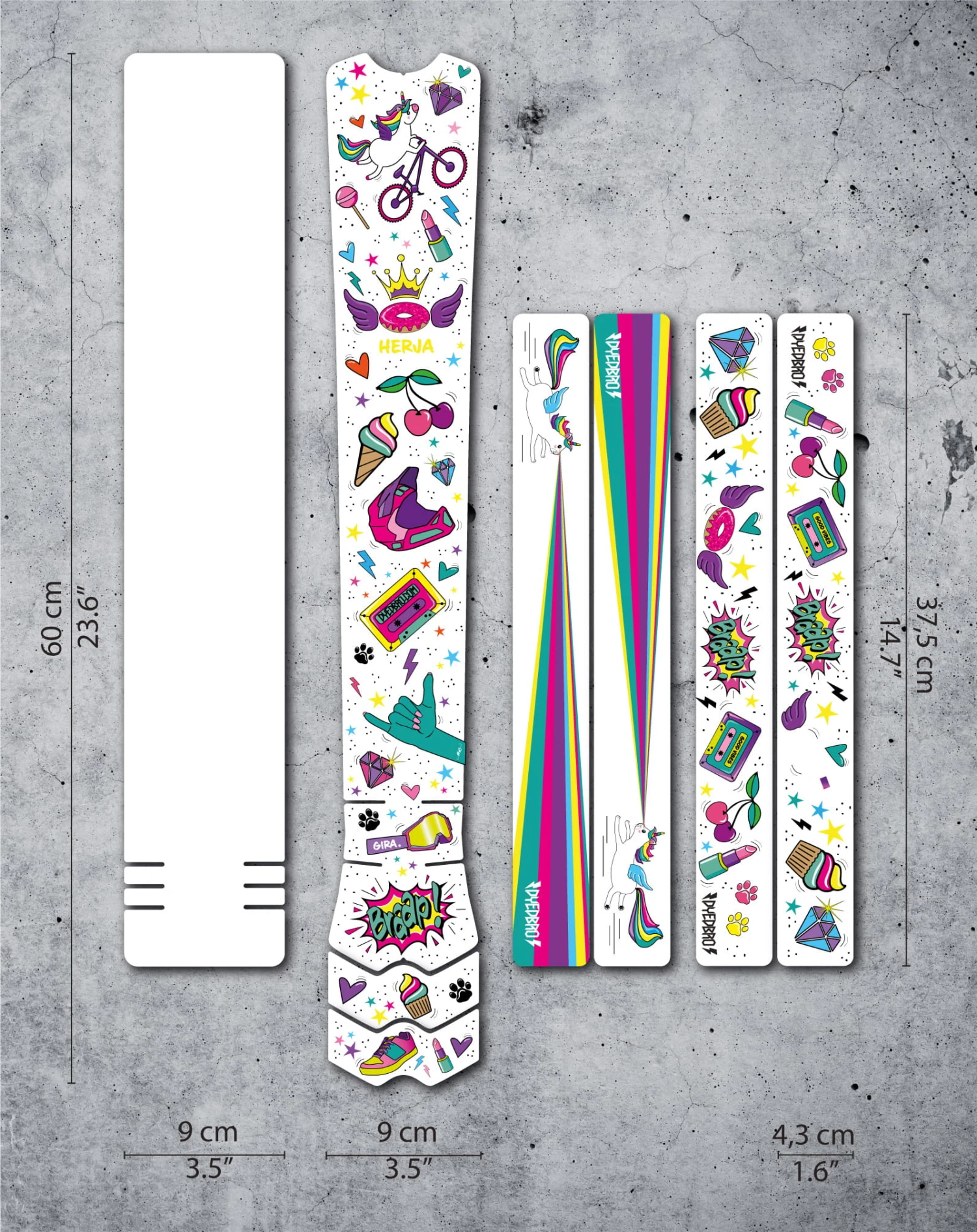 De set bestaat uit: 1x bovenbuisbeschermer, 2x folie voor grotere frames, 1x transparante onderbuisbeschermer, 2x kettingsteunbeschermers, 2x staande achtervorkbeschermers