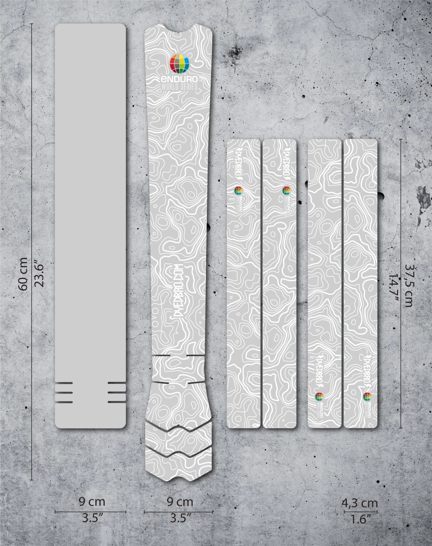 De framebeschermingskit van DyedBro geeft uw fiets een stijlvolle glans en houdt hem effectief vrij van krassen. Het kan worden gebruikt op alle buizen en schoren van het frame. Als gevolg van variaties in de productie, kunnen er kleine verschillen zijn in kleurtint. Dit is de witte EWS editie, die een uniek topografisch ontwerp heeft met het officiële Enduro World Series logo.