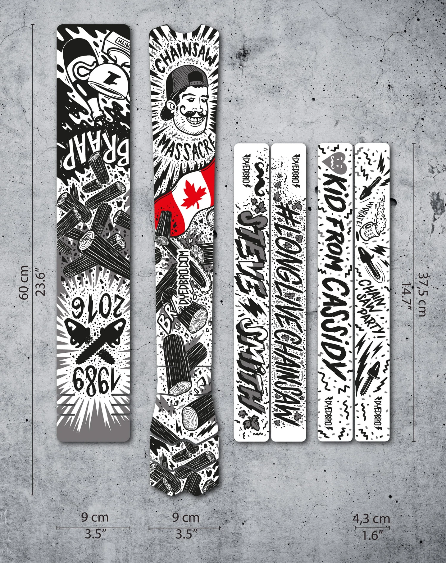 De set bestaat uit: 1x bovenbuisbeschermer, 2x folie voor grotere frames, 1x transparante onderbuisbeschermer, 2x kettingsteunbeschermers, 2x staande achtervorkbeschermers