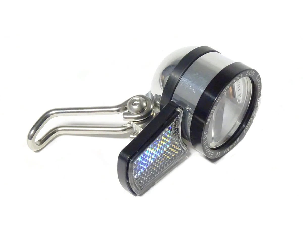 - Het inschakelen van koplamp en achterlicht gebeurt hier op het display van de aandrijving, daarom heeft de Edelux II DC 6 Volt geen schakelaar en achterlicht uitgang