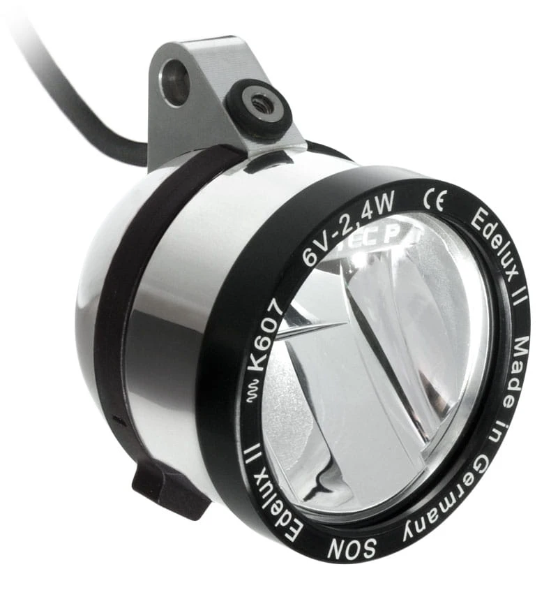 Naar boven toe is de lichtkegel goed gedimd, wat tegemoetkomende weggebruikers zal bevallen. De solide aluminium behuizing van de Edelux II garandeert mechanische duurzaamheid en is waterdicht afgedicht met een krasbestendige, antireflecterende glazen lens. De magnetische schakelring maakt comfortabel schakelen mogelijk, zelfs met handschoenen aan. De beproefde SON coaxiale kabel wordt gebruikt om verbinding te maken met de naafdynamo.