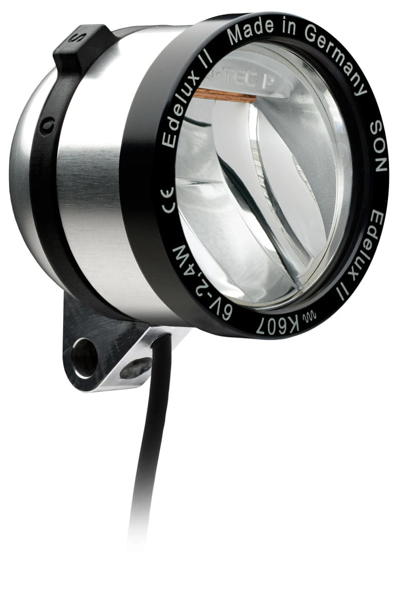 De solide aluminium behuizing van de Edelux II zorgt voor mechanische duurzaamheid en is waterdicht afgedicht met een krasbestendige, ontspiegelde glazen lens. De magnetische schakelring maakt comfortabel schakelen mogelijk, zelfs met handschoenen aan. De beproefde SON coaxiale kabel wordt gebruikt om verbinding te maken met de naafdynamo.