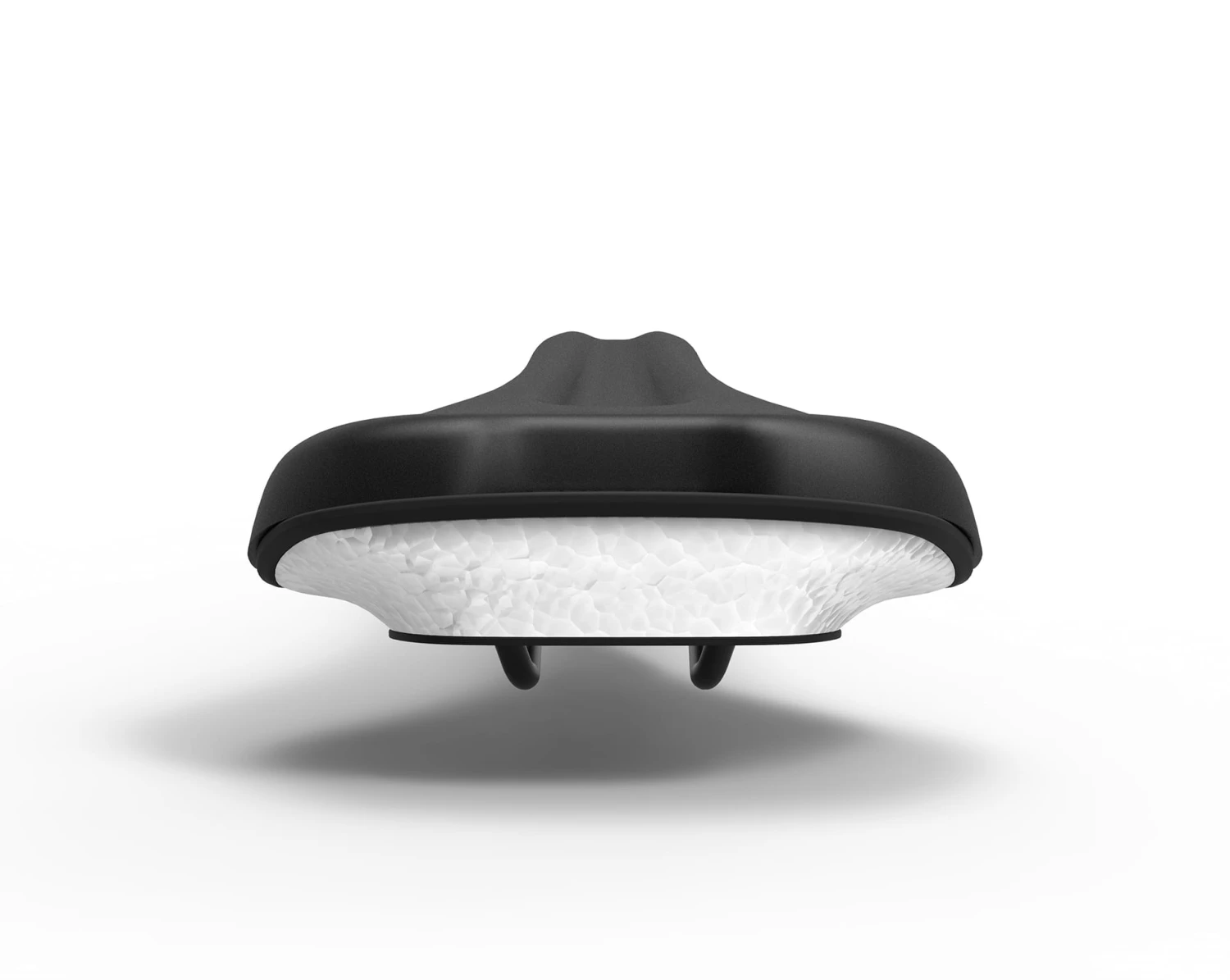 - De onderste, stijve zadelschaal ondersteunt de constructie en leidt de trillingen van de grond naar de ergonomische kern
