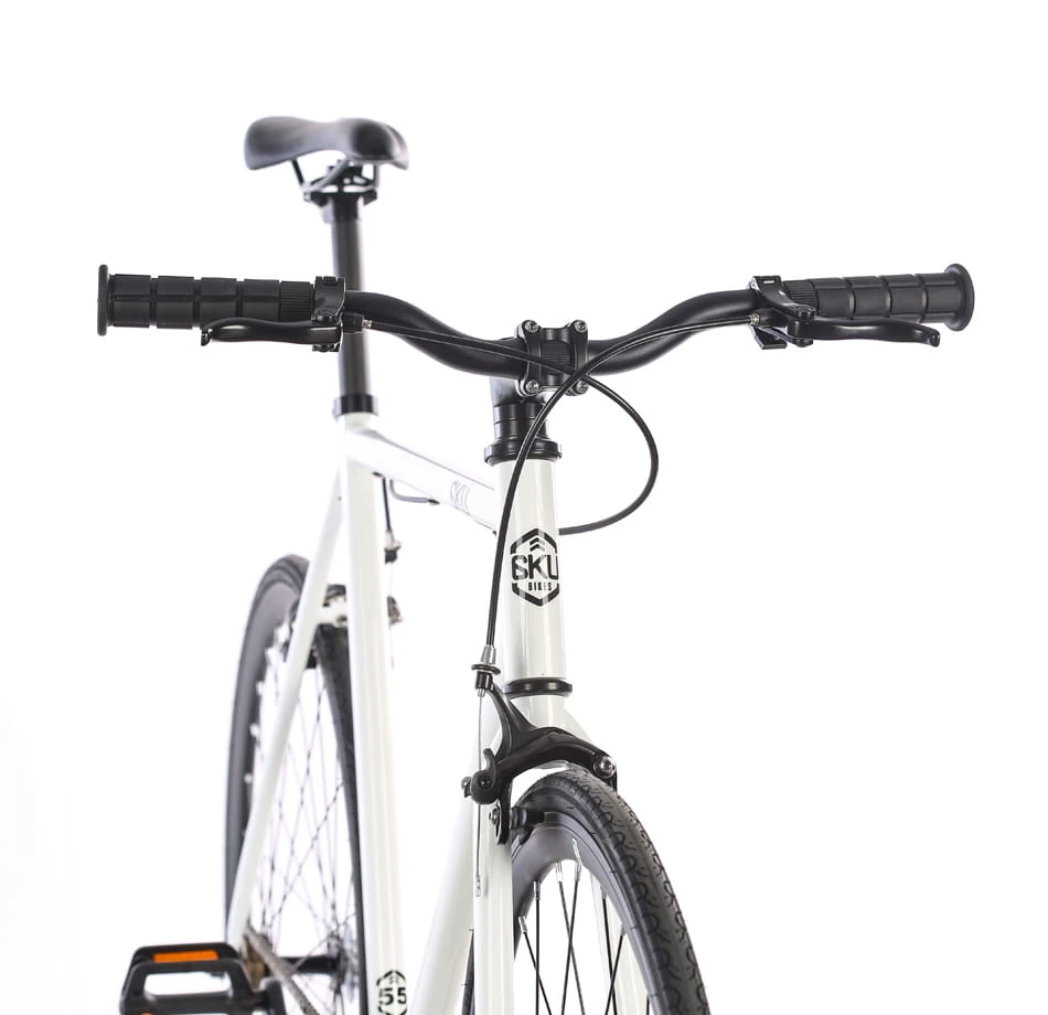 De Evian 2 van 6KU is een singlespeed/fixed complete fiets die op elk vlak coherent is. Het eerste wat opvalt is de witte, extreem hoogwaardige lak. In combinatie met de eigen hoge flensvelgen is dit het halve werk. De aandrijving werkt klassiek via een flip-flop naaf, waarmee je zowel singlespeed als fixed kunt rijden.