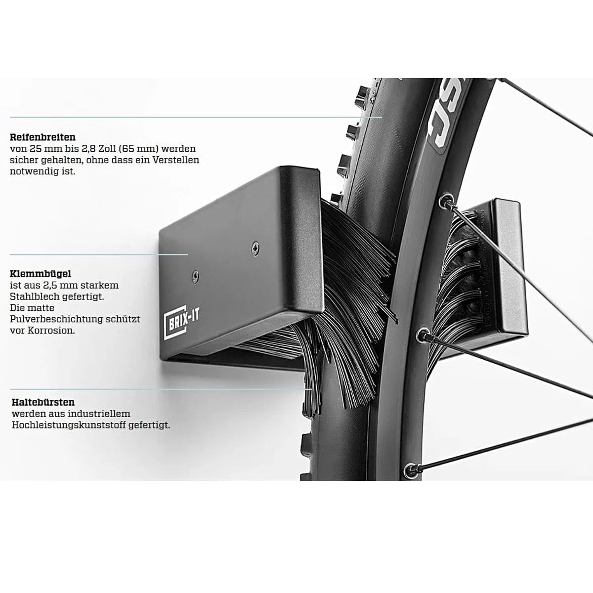 De BRIX-IT is een revolutionaire fietsmuurbeugel. De BRIX-IT, bij toeval uitgevonden door een Zwabische familieman en tot in het kleinste detail uitgewerkt tot een gepatenteerd product, is de eerste op een borstel gebaseerde bevestiging voor fietsen. De hoogwaardige constructie houdt veel voorkomende soorten fietsen – inclusief e-bikes – voorzichtig en veilig vast, en het gebruik is kinderspel!