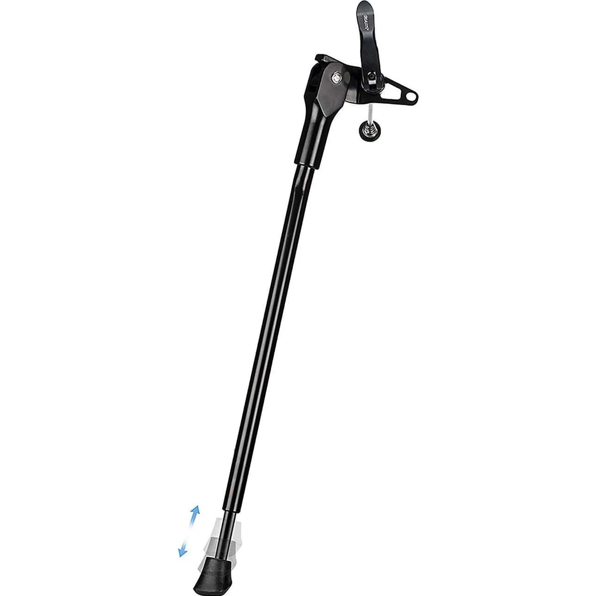 Zijstandaard voor fietsen met schijfrem zonder zijstandaardbevestiging. Betrouwbare klemming via de quick-release bij de dropout.