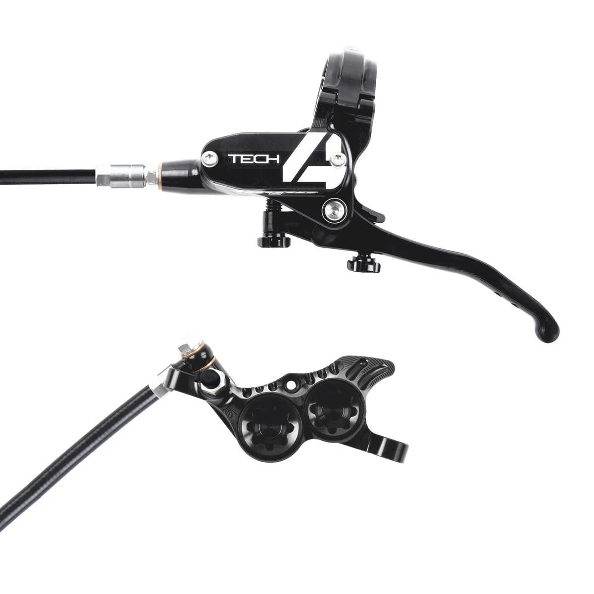De nieuwe Tech 4 V4 schijfrem is gebaseerd op meer dan 25 jaar ervaring in het ontwerpen en fabriceren van hydraulische remsystemen. De Tech 4 gebruikt een volledig nieuwe interne afdichting voor minder wrijving en het draaipunt draait op rollagers, waardoor de veerconstante kan worden verlaagd. De lagere veerconstante resulteert op zijn beurt in een lichtere hefboomwerking, waardoor de rijder minder snel moe wordt en onze legendarische feel en modulatie behouden blijven. De vernieuwde E4-remklauw maakt gebruik van hybride roestvrijstalen zuigers met een fenolhouten inzetstuk dat zorgt voor soepelere bewegingen en minder onderhoud, terwijl het in staat is om hoge temperaturen aan te kunnen zonder warmteoverdracht tijdens extreem gebruik.
