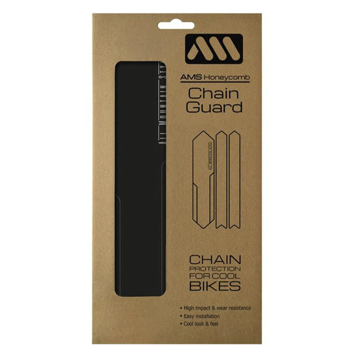 De zwarte CHAIN Guard van AMS is speciaal ontwikkeld om de ketting en achtervork van XC, cross en racefietsen te beschermen tegen stoten, krassen en lakschade. De framebeschermingssticker bestaat uit een honingraat PVC lijm en is zeer gemakkelijk aan te brengen. Het wordt gekenmerkt door een hoge slagvastheid en slijtvastheid. De duurzame PVC-honingraatstructuur is 380 micrometer dik en weegt slechts 15 gram.