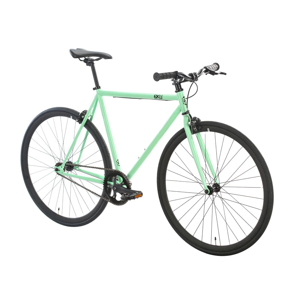 De Milan 2 van 6KU is een klassieke singlespeed/vaste complete fiets die op het eerste gezicht op een Bianchi lijkt door de speciale turquoise kleur. In combinatie met de velgen van het bedrijf zelf, maakt het nogal een indruk. De aandrijving werkt klassiek via een flip-flop naaf, waarmee je zowel singlespeed als fixed kunt rijden.