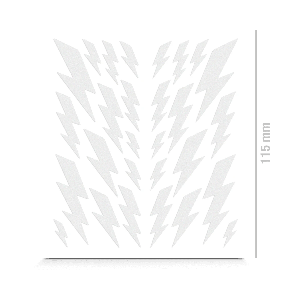 De reflecterende stickers in de vorm van bliksemschichten staan voor dynamiek en kracht. Het versieren van helmen met ze aan beide zijden is een mogelijkheid. Met drie of vier van deze stickerkits kun je zelfs een heel (fiets)frame versieren.