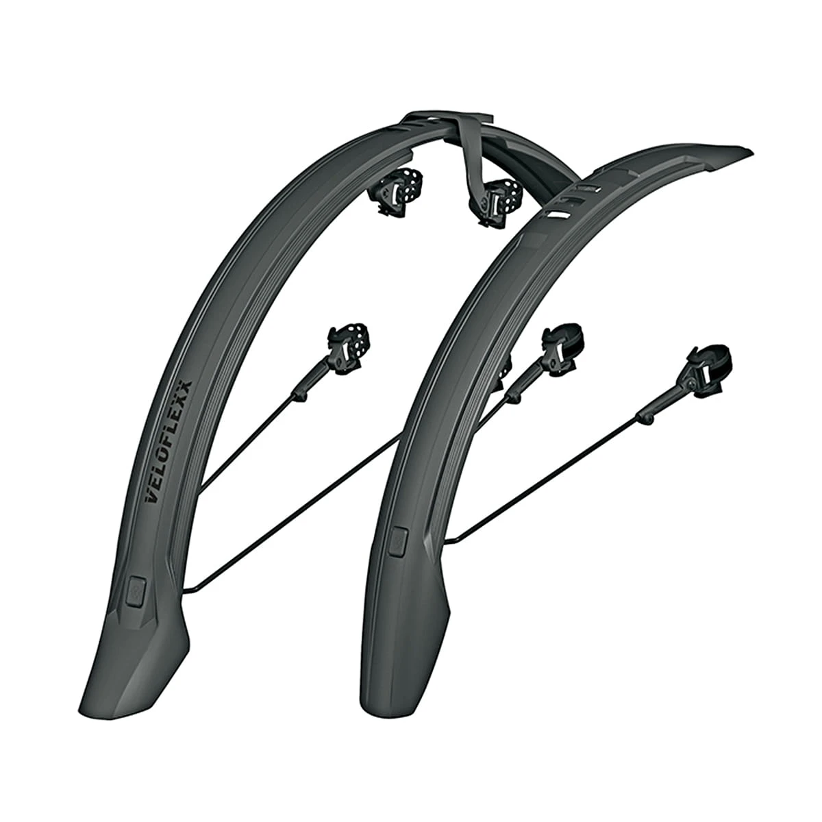 De Veloflexx wielset combineert de stabiliteit van een vast gemonteerd spatbord met de flexibiliteit van een insteekbaar wielset. Aangezien de Veloflexx een doorlopende wielbeschermer heeft, is hij alleen compatibel met schijfremmen. Met de Veloflexx-brug kan het achterspatbord zonder gereedschap aan de bovenkant van de staande achtervork worden bevestigd met behulp van rubberen riemen. Deze montageoplossing is niet langer afhankelijk van de dwarsbalk waaraan de remklauw van de velgrem gewoonlijk is bevestigd. Aan de voorkant wordt de Veloflexx met een rubberen klittenband of kabelbinder aan de drievoudige klem bevestigd. De frame-adapters maken het mogelijk hem op elke vork te monteren en zijn tevens in hoek verstelbaar. De zwart gecoate stangen zorgen voor nog meer grip.