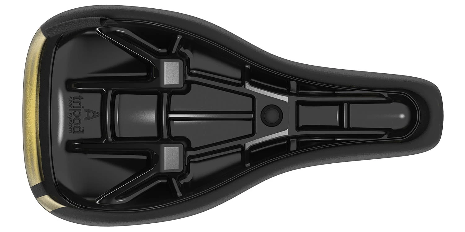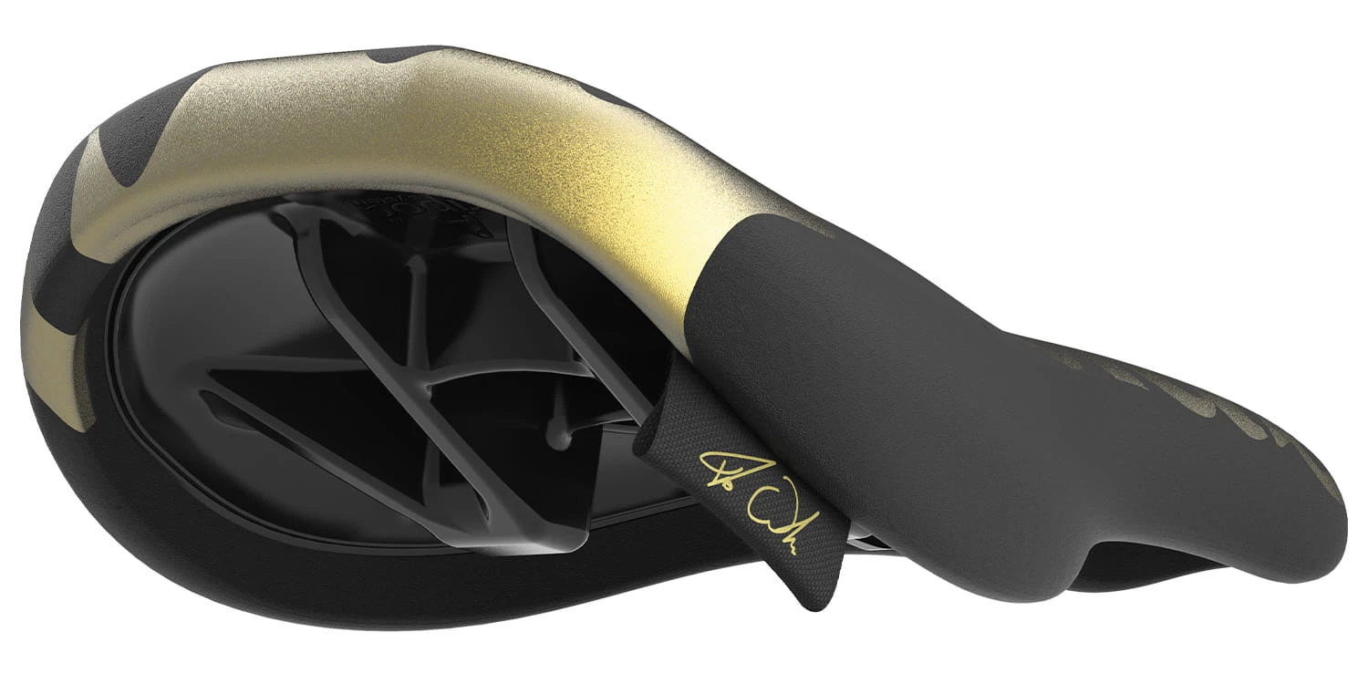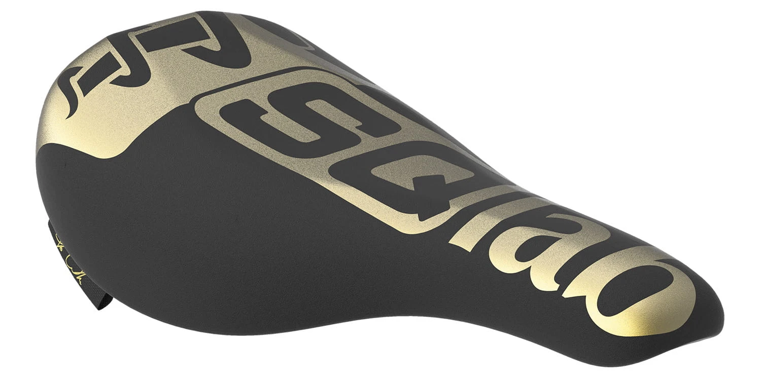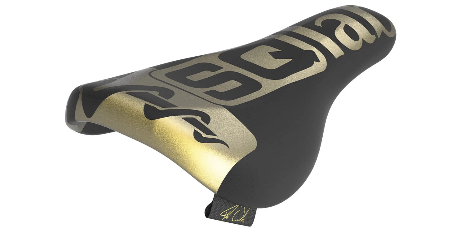 Het zadel is uitgevoerd in een zwart/goud design en de vorm past op elke trialfiets. Door zijn afgeplatte vorm biedt het zadel een maximaal oppervlak tijdens stoten, waardoor de druk vermindert.