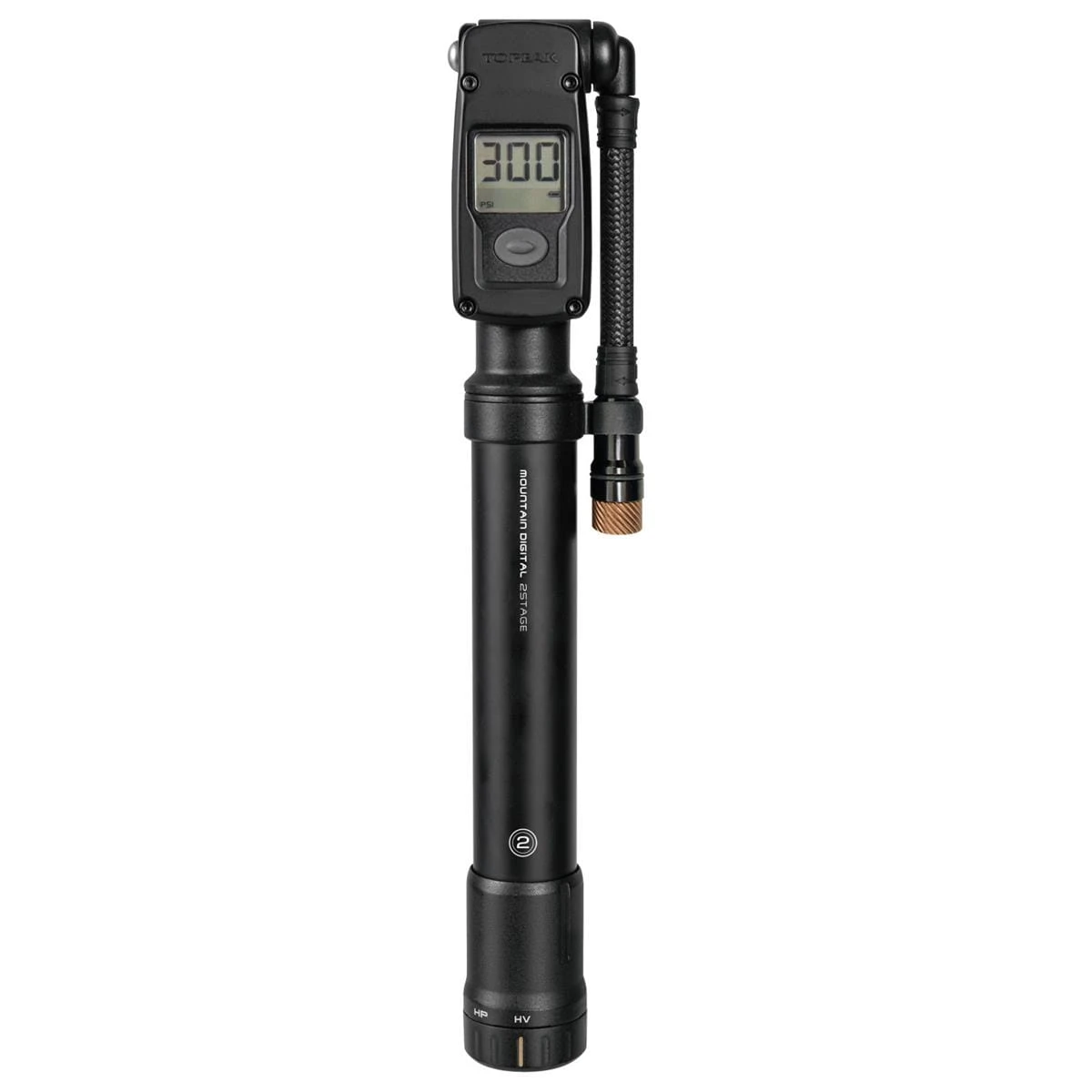 De Mountain Digital 2Stage minipomp heeft een innovatieve 2Stage keuzeschakelaar waarmee u kunt kiezen tussen hoge druk voor het oppompen van luchtgeveerde vorken en schokdempers of hoog volume voor het oppompen van mountainbikebanden. De geïntegreerde, gemakkelijk af te lezen digitale drukmeter biedt nauwkeurige drukmetingen tot 20,7 bar / 300 psi. De Pressure-Rite-Connector is compatibel met Schrader en Presta ventielen. De robuuste, flexibele en 360° draaibare slang garandeert een zacht opblazen. Met de luchtdrukknop is ook snel en eenvoudig de juiste luchtdruk in te stellen.