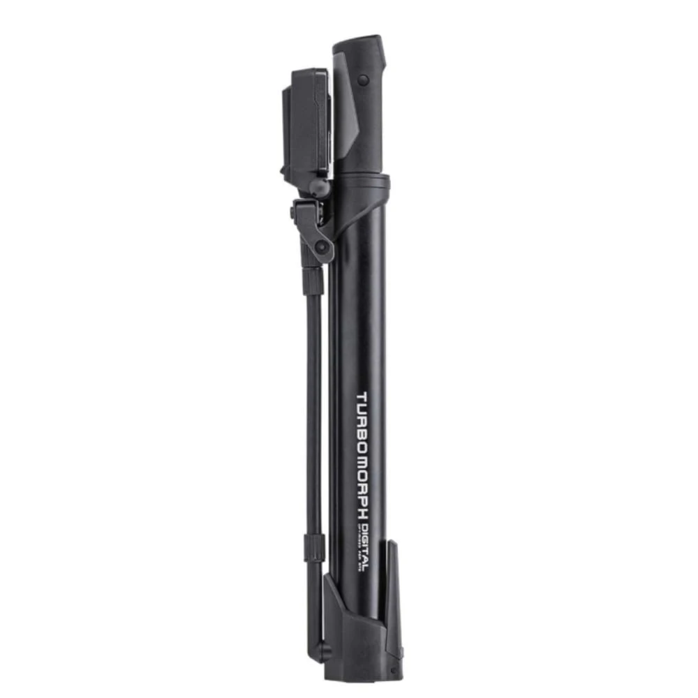 Evolutie van de bekroonde Morph pompserie – De Turbo Morphâ„¢ Digital is een vernuftige combinatie van stand-up en minipomp. Met de aan de bovenzijde gemonteerde, uitklapbare digitale drukmeter kunt u de luchtdruk nauwkeurig instellen tot 160 psi / 11 bar. De uitklapbare standaard en de flexibele slang zorgen voor een veilige stand en efficiënter en ventielvriendelijker pompen.
