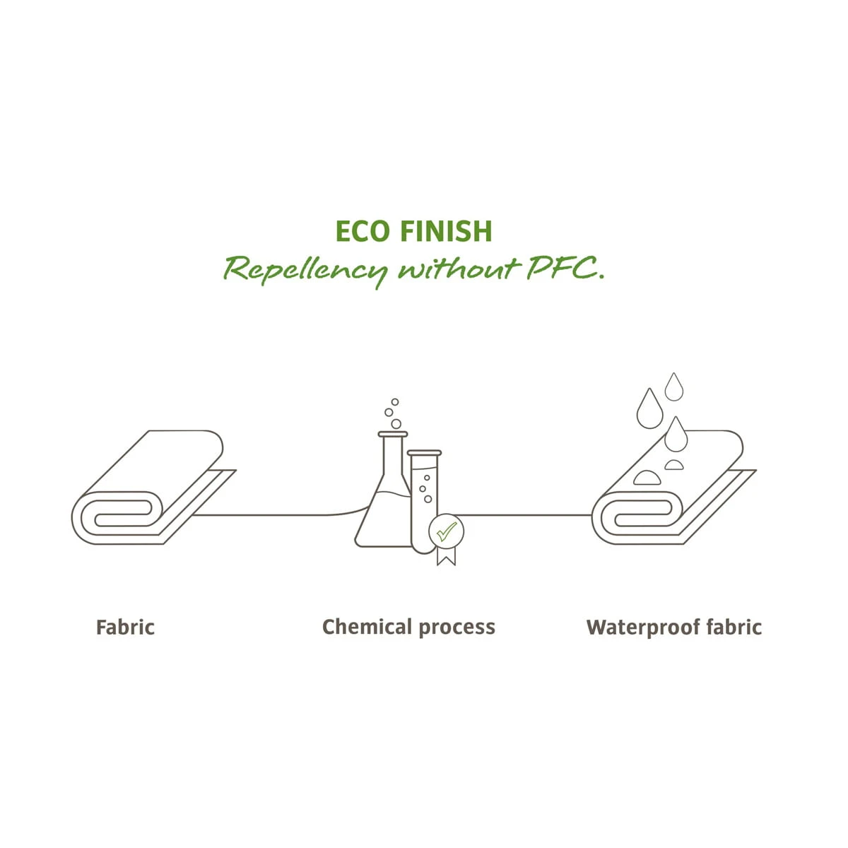 De Trailpack is waterafstotend dankzij Eco Finish zonder PFC en is milieuvriendelijk geproduceerd volgens Green Shape criteria.